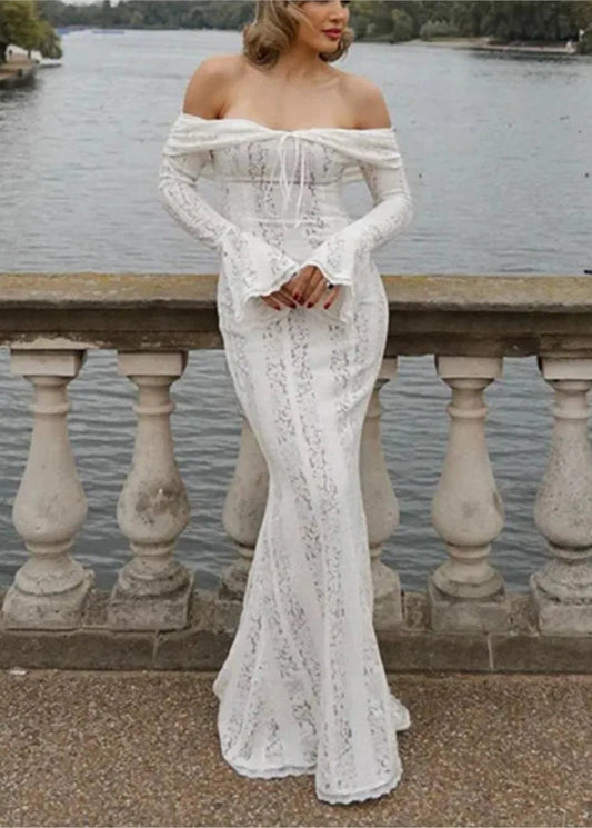 Off-Shoulder White Lace Maxi Dress