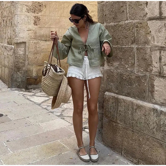 Linen Lace-Up Long Sleeve Blouse